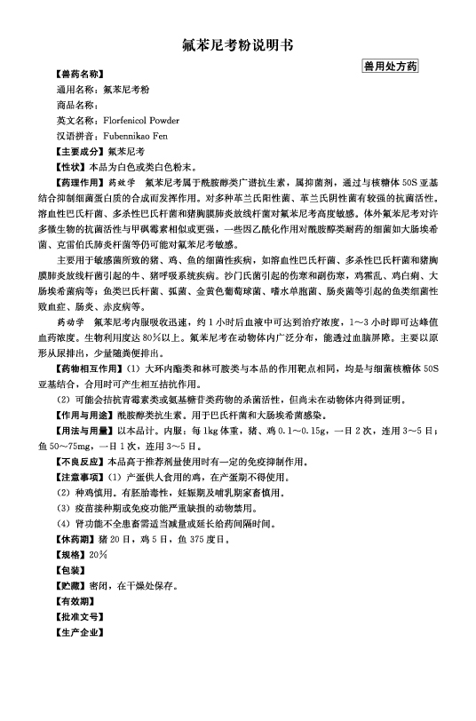 用于巴氏杆菌和大肠杆菌所致的细菌性疾病。
