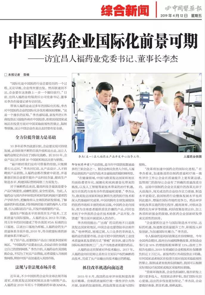 10多年前李杰就意识到,企业要实现可持续发展,必须依靠不断的自我升级和走出去,这让宜昌人福药业制定并启动了国际化战略。到2018年,企业产品已在全球30个国家和地区注册与销售。