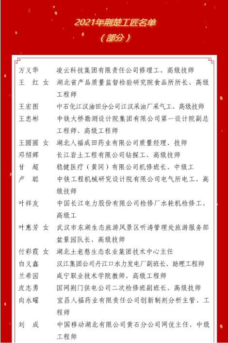 11月10日,在2021年荆楚工匠培育创建工作视频会议上,湖北省总工会公布100位2021年“荆楚工匠”,世界杯官方网页版集团向永曜和王圆圆入选。