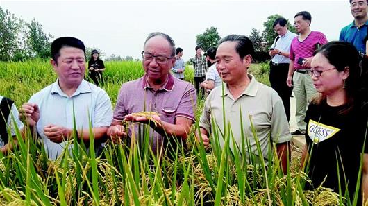图为:谢华安院士在黄陂多倍体水稻育种基地指导。(湖北日报全媒记者 夏中华 摄)