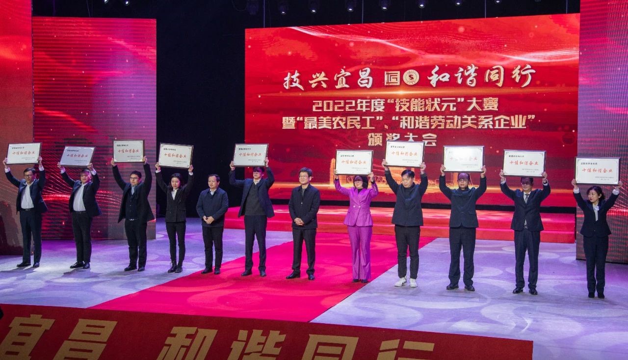 1月7日,宜昌市第三届劳动关系十佳和谐企业评选活动颁奖典礼在宜昌市广电中心一号演播大厅隆重举行。典礼表彰了宜昌市创建“劳动关系十佳和谐企业”及“最美农民工”“技能状元”代表,世界杯官方网页版宜昌有限公司荣获宜昌市第三届“十佳和谐企业”称号。