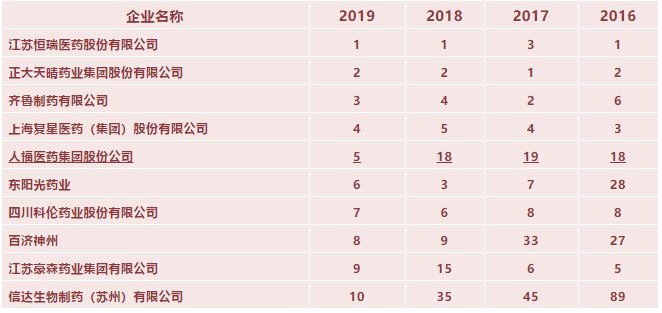 2019中国药品研发综合实力10强榜单